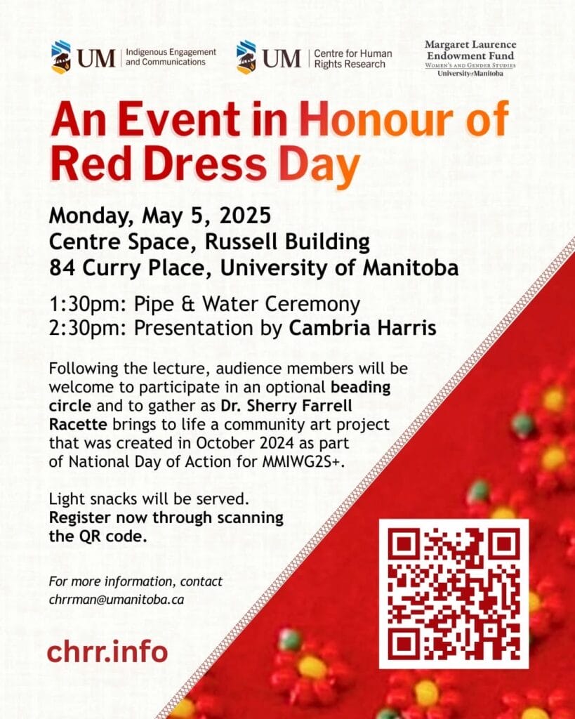 Join the Centre for Human Rights Research and UM Indigenous for an event in honour of Red Dress Day.